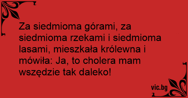 Za siedmioma górami, za siedmioma rzekami i siedmioma lasami, mieszkała królewna i mówiła: Ja, to сhоlеrа mam wszędzie tak daleko!