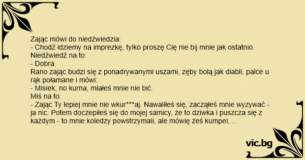 - Zając Ty lepiej mnie nie wkur***aj. Nawaliłeś się, zacząłeś mnie wyzywać - ja nic. Potem doczepiłeś się do mojej samicy, że to dziwka i puszcza się z każdym - to mnie koledzy powstrzymali, ale mówię żeś kumpel, obiecałem i w ogóle... Potem najeżdżałeś na moją matkę - to dobrze żeś upadł, bo bym Ci łeb urwał. No nic, jakoś mi się udało Cię nie bić....