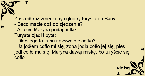 - Ja jodłem cofło mi się, żona jodła cofło jej się, pies jodł cofło mu się, Maryna dawaj miskę, bo turyście się cofło.