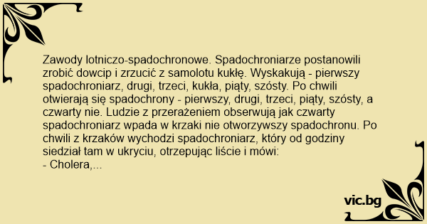 Zawody lotniczo-spadochronowe. Spadochroniarze postanowili zrobić dowcip i zrzucić z samolotu kukłę. Wyskakują - pierwszy spadochroniarz, drugi, trzeci, kukła, piąty, szósty. Po chwili otwierają się spadochrony - pierwszy, drugi, trzeci, piąty, szósty, a czwarty nie. Ludzie z przerażeniem obserwują jak czwarty spadochroniarz wpada w krzaki nie otworzywszy spadochronu. Po chwili z krzaków wychodzi spadochroniarz, który od godziny siedział tam w ukryciu, otrzepując liście i mówi: