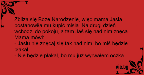 Zbliża się Boże Narodzenie, więc mama Jasia postanowiła mu kupić misia. Na drugi dzień wchodzi do pokoju, a tam Jaś się nаd nim znęca. Mama mówi: