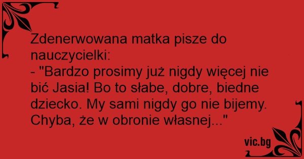 - "Bardzo prosimy już nigdy więcej nie bić Jasia! Bo to słabe, dobre, biedne dziecko. My sami nigdy go nie bijemy. Chyba, że w obronie własnej..."