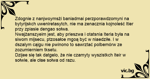 Nwajżanszyeim jest, aby prieszwa i otatsnia lteria była na siwom mijsecu, ptzosałoe mgoą być w niaedziłe. I w dszalym cąigu nie pwinono to sawrztać polbemórw ze zozumierniem tksetu.