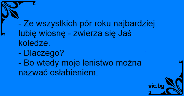 - Ze wszystkich pór roku najbardziej lubię wiosnę - zwierza się Jaś koledze.