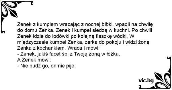 Zenek z kumplem wracając z nocnej bibki, wpadli na chwilę do domu Zenka. Zenek i kumpel siedzą w kuchni. Po chwili Zenek idzie do lodówki po kolejną flaszkę wódki. W międzyczasie kumpel Zenka, zerka do pokoju i widzi żonę Zenka z kochankiem. Wraca i mówi: