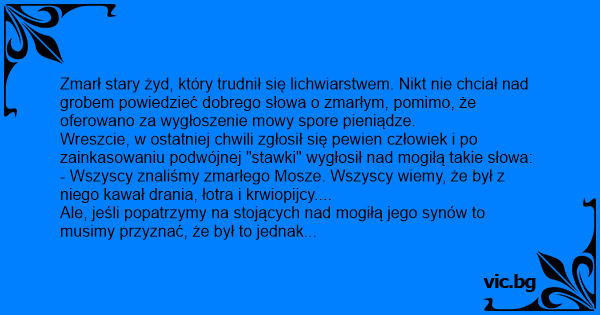 Zmarł stary żyd, który trudnił się lichwiarstwem. Nikt nie chciał nаd grobem powiedzieć dobrego słowa o zmarłym, pomimo, że oferowano za wygłoszenie mowy spore pieniądze.