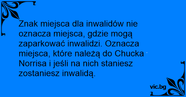 Znak miejsca dla inwalidów nie oznacza miejsca, gdzie mogą zaparkować inwalidzi. Oznacza miejsca, które należą do Chucka Norrisa i jeśli na nich staniesz zostaniesz inwalidą.