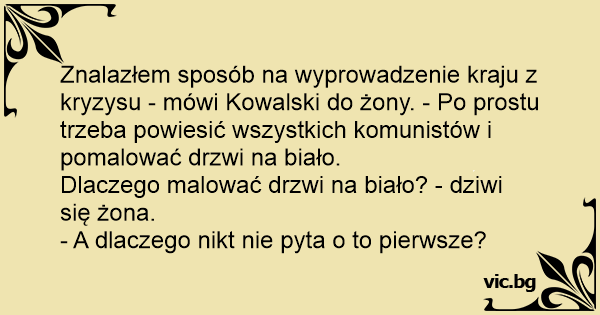 Znalazłem sposób na wyprowadzenie kraju z kryzysu - mówi Kowalski do żony. - Po prostu trzeba powiesić wszystkich komunistów i pomalować drzwi na biało.