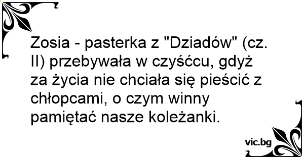 Zosia - pasterka z "Dziadów" (cz. II) przebywała w czyśćcu, gdyż za życia nie chciała się pieścić z chłopcami, o czym winny pamiętać nasze koleżanki.