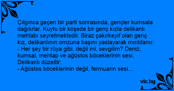 - Her şey bir rüya gibi, değil mi, sevgilim? Deniz, kumsal, mehtap ve ağüstos böceklerinin sesi. Delikanlı düzeltir: