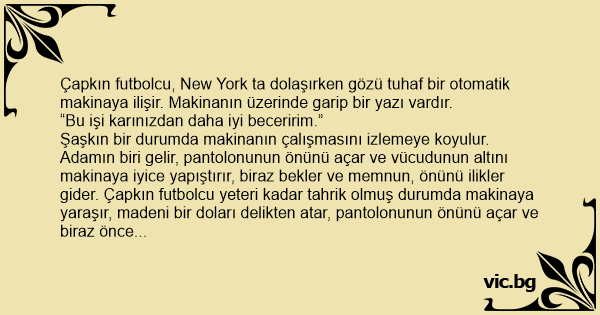Çapkın futbolcu, New York ta dolaşırken gözü tuhaf bir otomatik makinaya ilişir. Makinanın üzerinde garip bir yazı vardır.