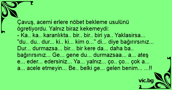 Çavuş, acemi erlere nöbet bekleme usulünü ögretiyordu. Yalnız biraz kekemeydi: