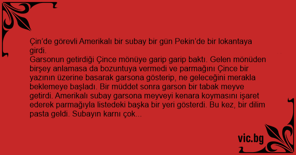 Garsonun getirdiği Çince mönüye garip garip baktı. Gelen mönüden birşey anlamasa da bozuntuya vermedi ve parmağını Çince bir yazının üzerine basarak garsona gösterip, ne geleceğini merakla beklemeye başladı. Bir müddet sonra garson bir tabak meyve getirdi. Amerikalı subay garsona meyveyi kenara koymasını işaret ederek parmağıyla listedeki başka bir yeri gösterdi. Bu kez, bir dilim pasta geldi. Subayın karnı çok acıkmıştı. Parmak yöntemiyle güzel bir yemek seçemeyeceğini de anlamış bulunuyordu. Çevresindeki masalara baktı. Karşı masada bir Çinli et yemeği yiyordu. Subay, karşı masadaki adamın yediği yemeği gösterdi ve garsona o yemekten getirmesini işaret etti. Yemek geldi. Subay büyük bir iştahla eti yemeye başladı. Birkaç lokma sonra, şimdiye dek bu татта bir et yemeği yemediğini fark etti. Pekin ördeklerinin ününü duymuştu. Bu acaba onun eti miydi?Garsonu çağırdı, eti gösterdi ve kollarını kanat gibi yaparak,