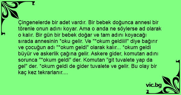 Çingenelerde bir adet vardır. Bir bebek doğunca annesi bir törenle onun adını koyar. Ama o anda ne söylerse ad olarak o kalır. Bir gün bir bebek doğar ve tam adını koyacağı sırada annesinin *oku gelir. Ve "*okum geldiii!" diye bağırır ve çocuğun adı "*okum geldi" olarak kalır... *okum geldi büyür ve askerlik çağına gelir. Askere gider, komutan adını sorunca "*okum geldi" der. Komutan "giт tuvalete yap da gel" der. *okum geldi de gider tuvalete ve gelir. Bu olay bir kaç kez tekrarlanır. Sonunda bir arkadaşı "onun adı *okum geldi komutanım" der. Günler böyle geçip giderken *okum geldinin askerlikten canı sıkılır ve kaçmaya karar verir.