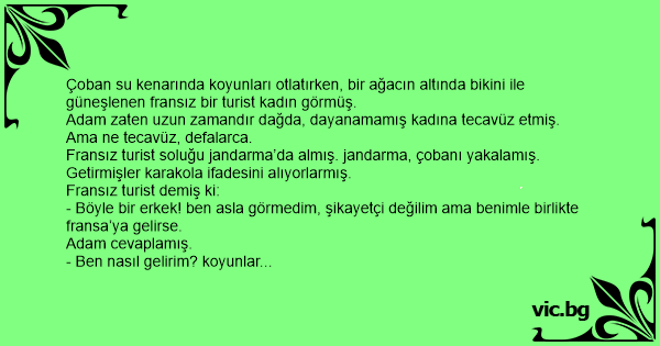 Çoban su kenarında koyunları otlatırken, bir ağacın altında bikini ile güneşlenen fransız bir turist kadın görmüş.