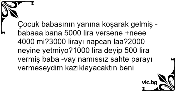 Çocuk babasının yanına koşarak gelmiş -babaaa bana 5000 lira versene +neee 4000 mi?3000 lirayı napcan laa?2000 neyine yetmiyo?1000 lira deyip 500 lira vermiş baba -vay namıssız sahte parayı vermeseydim kazıklayacaktın beni