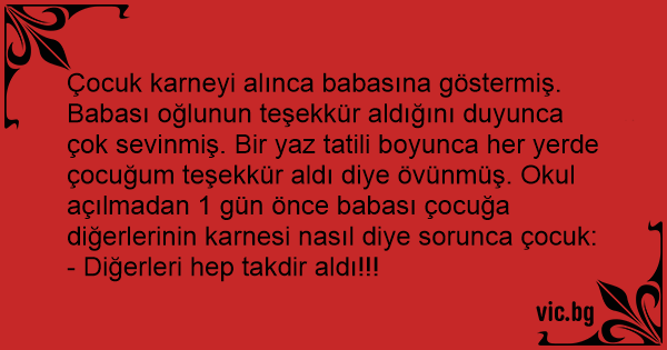 Çocuk karneyi alınca babasına göstermiş. Babası oğlunun teşekkür aldığını duyunca çok sevinmiş. Bir yaz tatili boyunca her yerde çocuğum teşekkür aldı diye övünmüş. Okul açılmadan 1 gün önce babası çocuğa diğerlerinin karnesi nasıl diye sorunca çocuk: