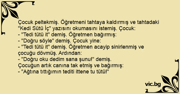 - "Tedi tütü it" demiş. Öğretmen acayip sinirlenmiş ve çocuğu dövmüş. Ardından:
