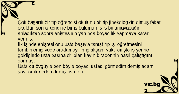 Usta da övgüyle ben böyle boyacı ustası görmedim demiş adam şaşırarak neden demiş usta da büyük bir hayranlıkla adama dönüp bir günde iki oda bir salon ve holu tek başına boyadığını söylemiş adamda ne var bunda demiş