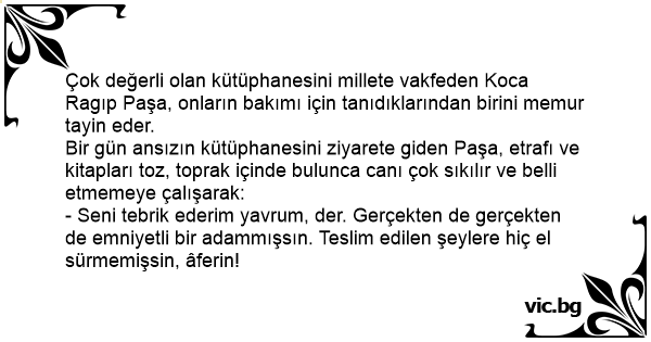 Çok değerli olan kütüphanesini millete vakfeden Koca Ragıp Paşa, onların bakımı için tanıdıklarından birini memur tayin eder.