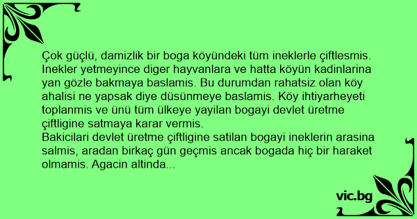Bakicilari devlet üretme çiftligine satilan bogayi ineklerin arasina salmis, aradan birkaç gün geçmis ancak bogada hiç bir haraket olmamis. Agacin altinda gevis getiren boganin bakicisi yanina gitmis ve :