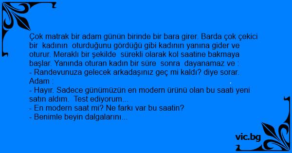 Çok matrak bir adam günün birinde bir bara girer. Barda çok çekici bir kadının oturduğunu gördüğü gibi kadının yanına gider ve oturur. Meraklı bir şekilde sürekli olarak kol saatine bakmaya başlar. Yanında oturan kadın bir süre sonra dayanamaz ve :