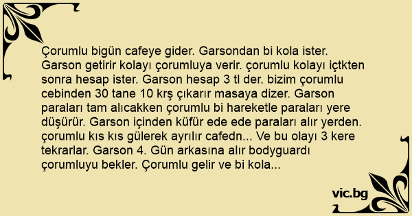 Çorumlu bigün cafeye gider. Garsondan bi kola ister. Garson getirir kolayı çorumluya verir. çorumlu kolayı içtkten sonra hesap ister. Garson hesap 3 tl der. bizim çorumlu cebinden 30 tane 10 krş çıkarır masaya dizer. Garson paraları tam alıcakken çorumlu bi hareketle paraları yere düşürür. Garson içinden küfür ede ede paraları alır yerden. çorumlu kıs kıs gülerek ayrılır cafedn... Ve bu olayı 3 kere tekrarlar. Garson 4. Gün arkasına alır bodyguardı çorumluyu bekler. Çorumlu gelir ve bi kola ister. Garson getirir kolayı çorumlu içtiktn sonra hesap ister garson arkasna alır bodyguardı hesap 3 tl der. çorumlu arkasndaki bodygardı görünce aynı hareketi yaparsam kesin dayak yerim der. Ve cebinden 5 tl çıkartr buyrun hesap der. Garsonda gülerek parayı alır ve cebinden 20 tane 10 krş çıkarıp yere saçar. -buyrun efendim paranızın üstü der. Çorumlu hiç bozuntuya vermeden cebindn 1 tl çıkartıp yere atar ve. -bi kola daha getir