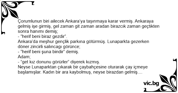 Çorumlunun biri ailecek Ankara’ya taşınmaya karar vermiş. Ankaraya gelmiş işe girmiş, gel zaman giт zaman aradan birazcık zaman geçtikten sonra hanımı demiş;