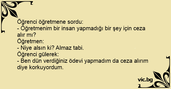Jantje in de klas Jantje vraagt aan de leraar. Meester, krijg je ook straf als je iets niet doet? Meester: :nee waarom? Jantje: omdat ik mijn huiswerk niet heb gemaakt.
