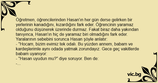 Öğretmen, öğrencilerinden Hasan'ın her gün derse gelirken bir yerlerinin kanadığını, kızardığını fark eder. Öğrencinin yaramaz olduğunu düşünerek üzerinde durmaz. Fakat biraz daha yakından tanıyınca, Hasan'ın hiç de yaramaz biri olmadığını fark eder. Yaralarının sebebini sorunca Hasan şöyle anlatır: