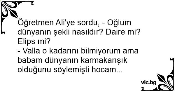 Öğretmen Ali'ye sordu, - Oğlum dünyanın şekli nasıldır? Daire mi? Elips mi?