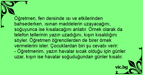 Öğretmen, fen dersinde ısı ve etkilerinden bahsederken, ısınan maddelerin uzayacağını, soğuyunca ise kısalacağını anlatır. Örnek olarak da telefon tellerinin yazın uzadığını, kışın kısaldığını söyler. Öğretmen öğrencilerden de birer örnek vermelerini ister. Çocuklardan biri şu cevabı verir: