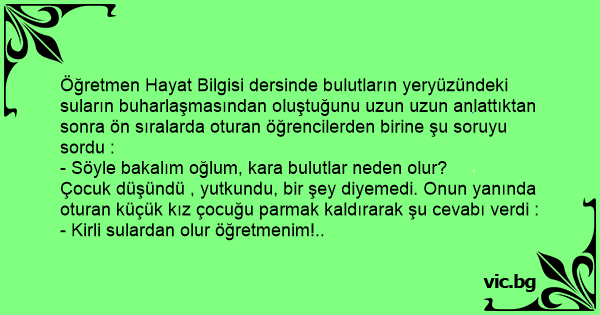 Öğretmen Hayat Bilgisi dersinde bulutların yeryüzündeki suların buharlaşmasından oluştuğunu uzun uzun anlattıktan sonra ön sıralarda oturan öğrencilerden birine şu soruyu sordu :