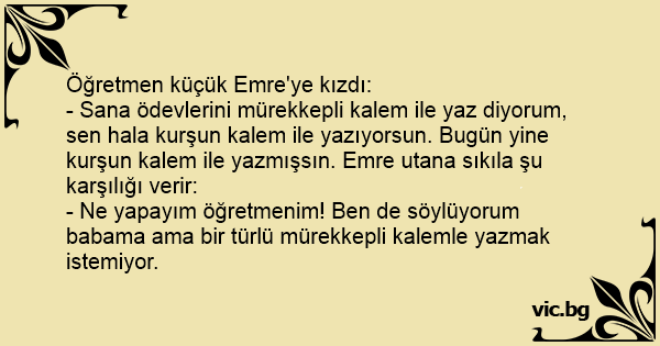 - Sana ödevlerini mürekkepli kalem ile yaz diyorum, sen hala kurşun kalem ile yazıyorsun. Bugün yine kurşun kalem ile yazmışsın. Emre utana sıkıla şu karşılığı verir:
