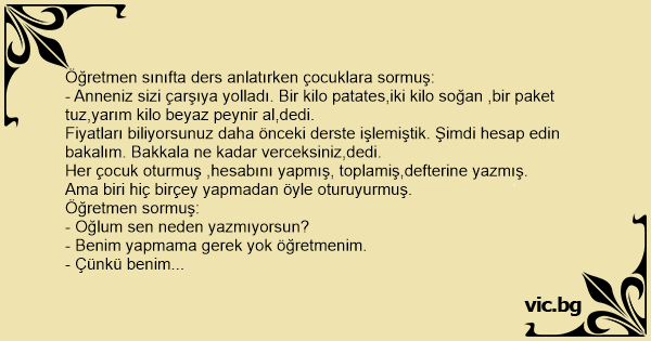 - Anneniz sizi çarşıya yolladı. Bir kilo patates,iki kilo soğan ,bir paket tuz,yarım kilo beyaz peynir al,dedi.
