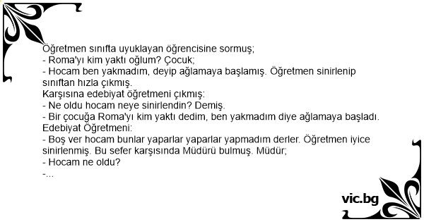 - Bir çocuğa Roma'yı kim yaktı dedim, ben yakmadım diye ağlamaya başladı. Edebiyat Öğretmeni: