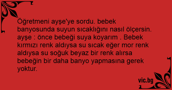 Öğretmeni ayşe'ye sordu. bebek banyosunda suyun sıcaklığını nasıl ölçersin. ayşe : önce bebeği suya koyarım . Bebek kırmızı renk aldıysa su sıcak eğer mor renk aldıysa su soğuk beyaz bir renk alırsa bebeğin bir daha banyo yapmasına gerek yoktur.
