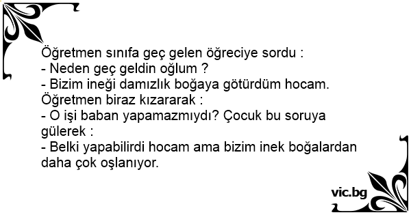 Домашно Hay que llevar a la vaca con el toro вовочка опоздал в школу. учительница интересуется причиной... Иванчо, защо вчера не беше на училище? В класната стая: Joãozinho chegou esbaforido e todo sujo, além de atrasado, na primeira aula. A professora se indignou: — Isso é hora? E sujo desse jeito? Isso não tem explicação! — Tem sim, professora: tive que levar a vaca lá de casa pro touro cobrir. — Mas o seu pai não pode fazer isso? — Poder, pode, mas acho... C'est un mec qui se promène à la campagne, lorsqu'il croise une toute petite fille de 6 ans qui conduit une vache au bout d'une corde. Le mec lui dit: - Ben ou tu vas comme ça avec ta vache? - Je... Padre recém chegado na paroquia do interior encontra na estrada uma menina de uns seis anos, puxando uma vaca. - Onde vai, minha menina? - Vou levar a vaca para cruzar com o touro do Seu Zé. O... Little Johnny walks a cow through the village square. The mayor sees him and asks, "Hey Johnny, where are you going with the cow?" "I'm taking her to the bulls so she would get impregnated,"... Jantje komt te laat op school en zegt: "Ik moest de stier wegbrengen om een koe te dekken." Onderwijzer, geirriteerd: "Kan je vader dat niet doen?" Jantje: "Zeker, maar de stier kan het beter." Certo dia na roça, o pai mandou seu filho levar o boi para a vila mais próxima para cruzá-lo com uma vaca. No meio do caminho, o menino encontra um padre. O padre, vendo o menininho tão pequeno... Сільська школа: — Петре! Ти чому вчора в школі не був? — Та ми з батьком корову до бика водили. — А що, батько сам не міг? — Та міг, але бик краще. Трпе зошто не дојде вчера на школо? - Морав да ја носам кравата кај бикот. - Зарем татко ти не можеше тоа да го направи? - Па можеше, али сепак бикот подобро ќе ја заврши работата.