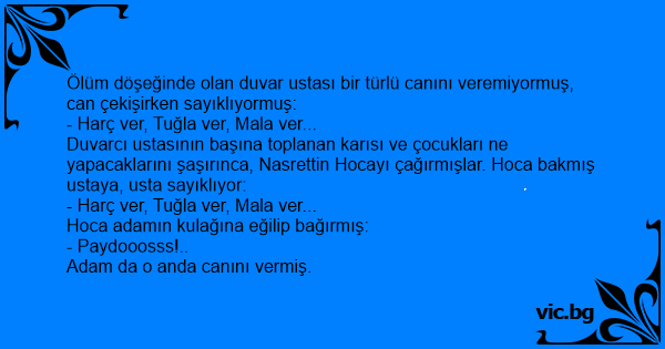 Ölüm döşeğinde olan duvar ustası bir türlü canını veremiyormuş, can çekişirken sayıklıyormuş:
