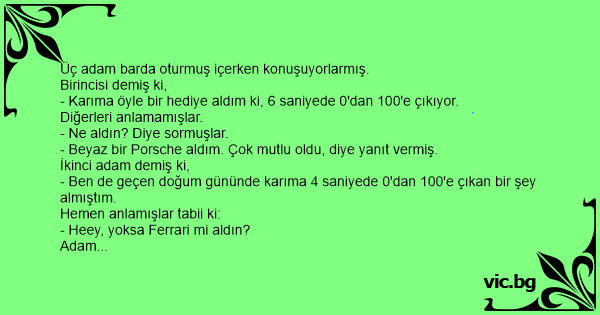 - Karıma öyle bir hediye aldım ki, 6 saniyede 0'dan 100'e çıkıyor.