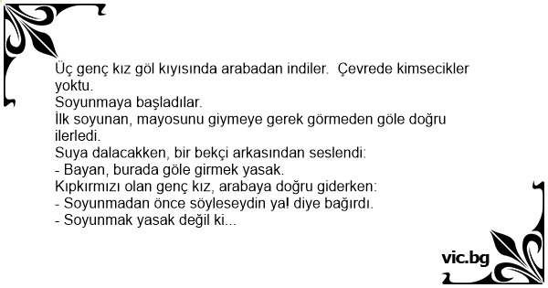 Млада жена се съблича и влиза в реката да се къпе. На брега на язовир жена решила да по плува. Baden verboten Ο αστυνόμος - Fröken, här är det förbjudet att bada. - Varför sa du inte det innan jag klädde av mig? - Att klä av sig är inte förbjudet. Egy csinos, fiatal lány fürdeni készül a patakban. Amikor már éppen be akar menni a vízbe, a bokrok közül kilép egy rendőr és odalép a lányhoz: - Elnézést kisasszony, gondolom maga városi, és nem... Policists meitenei: - Meitenīt, šeit nedrīkst peldēties! - Bet kāpēc jūs man to neteicāt, kad es izģērbos? - Izģērbties šeit nav aizliegts! Un politist pe malul unui lac ii zice unei tinere: - Domnisoara, aici este interzis scaldatul ! - Dar de ce nu mi-ati spus asta inainte de a ma dezbraca ? - Pentru ca dezbracatul nu e interzis... Un jour, une belle brune décide d’aller se baigner dans un lac désert. Elle arrive, regarde autour d’elle pour s’assurer qu’il n’y a personne et enlève ses vêtements. Au moment où elle s’apprête à... Policininkas: - Panele, man teks jus nubausti. Šiame ežere maudytis draudžiama. Panelė: - Galėjot pasakyti tuomet, kai dar nebuvau nusirengusi… Policininkas: - Prie šio ežero nusirengti nedraudžiama.