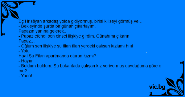 İki hristiyan arkadaş yolda yürürken biri diğerine - Biraz bekle ben günah çıkartıp gelicem demiş ve kiliseye girmiş. Rahip anlat evladım ne günah işledin demiş genç - peder ben zina yaptım demiş...