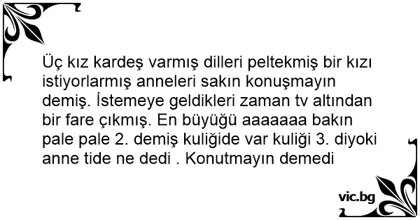 Üç kız kardeş varmış dilleri peltekmiş bir kızı istiyorlarmış anneleri sakın konuşmayın demiş. İstemeye geldikleri zaman tv altından bir fare çıkmış. En büyüğü aaaaaaa bakın pale pale 2. demiş kuliğide var kuliği 3. diyoki anne tide ne dedi . Konutmayın demedi
