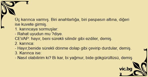 Üç karınca varmış. Biri anahtarlığa, biri paspasın altına, diğeri ise kuvete girmiş.