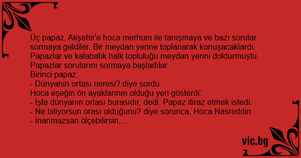 - Kendisinden gayet emindi. Acaba dünyanın yuvarlak olduğunu ta o zaman tahmin etmiş miydi? Çünkü dünya yuvarlak olduğuna göre her yer dünyanın ortası olabilir. fıkraoku. Com