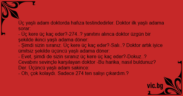 - Şimdi sizin sıranız. Üç kere üç kaç eder?-Salı..? Doktor artık iyice ümitsiz şekilde üçüncü yaşlı adama döner: