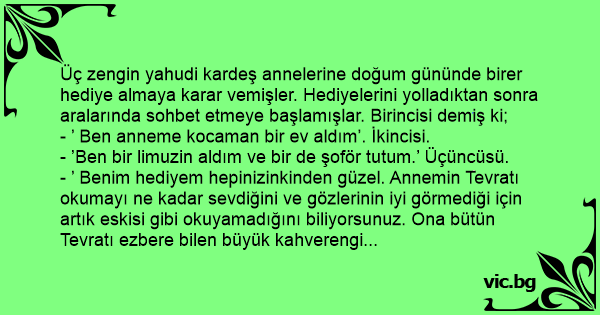 Üç zengin yahudi kardeş annelerine doğum gününde birer hediye almaya karar vemişler. Hediyelerini yolladıktan sonra aralarında sohbet etmeye başlamışlar. Birincisi demiş ki;