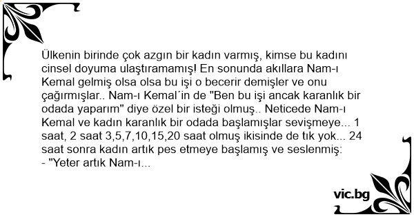 Ülkenin birinde çok azgın bir kadın varmış, kimse bu kadını cinsel doyuma ulaştıramamış! En sonunda akıllara Nam-ı Kemal gelmiş olsa olsa bu işi o becerir demişler ve onu çağırmışlar.. Nam-ı Kemal´in de "Ben bu işi ancak karanlık bir odada yaparım" diye özel bir isteği olmuş.. Neticede Nam-ı Kemal ve kadın karanlık bir odada başlamışlar sevişmeye... 1 saat, 2 saat 3,5,7,10,15,20 saat olmuş ikisinde de tık yok... 24 saat sonra kadın artık pes etmeye başlamış ve seslenmiş: