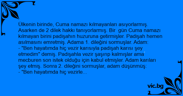 Ülkenin birinde, Cuma namazı kılmayanları asıyorlarmış. Asarken de 2 dilek hakkı tanıyorlarmış. Bir gün Cuma namazı kılmayan birini padişahın huzuruna getirmişler. Padişah hemen asılmasını emretmiş. Adama 1. dileğini sormuşlar. Adam: