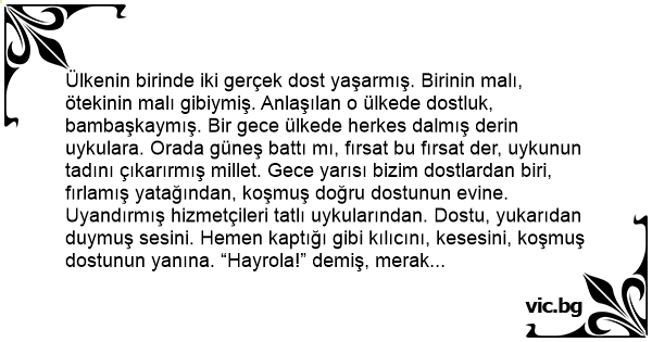 Ülkenin birinde iki gerçek dost yaşarmış. Birinin malı, ötekinin malı gibiymiş. Anlaşılan o ülkede dostluk, bambaşkaymış. Bir gece ülkede herkes dalmış derin uykulara. Orada güneş battı mı, fırsat bu fırsat der, uykunun tadını çıkarırmış millet. Gece yarısı bizim dostlardan biri, fırlamış yatağından, koşmuş doğru dostunun evine. Uyandırmış hizmetçileri tatlı uykularından. Dostu, yukarıdan duymuş sesini. Hemen kaptığı gibi kılıcını, kesesini, koşmuş dostunun yanına. “Hayrola!” demiş, merak içinde, soluk soluğa. “Sen, kolay kolay uyandırmazsın kimseyi, uykuyu da seversin üstelik. Kumarda kaybettiysen; al şu keseyi. Evini bastılarsa; işte buradayız ben ve kılıcım. Haydi gidip haklarından gelelim. Yalnız yatamaz mı oldun yoksa? Benim güzel cariyeyi al giт öyleyse.”